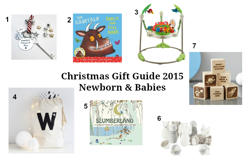 1. Personalised Santa Keys | 2. Gruffalo Touch & Feel Book | 3. Fisher Price Rainforest Jumperoo | 4. Fabric Printed Storage Sack | 5. Slumberland CD | 6. Animal Skittles | 7. Personalised Baby Keepsake Building Blocks