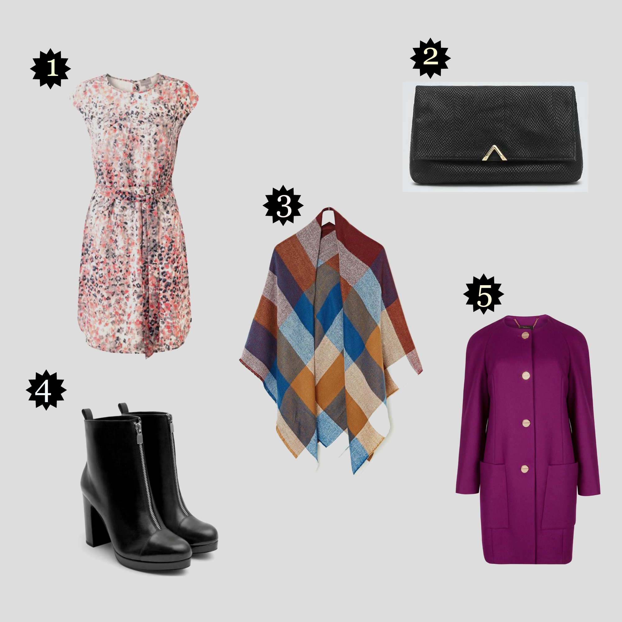 1.Dress | 2. Bag | 3. Oversized Scarf | 4. Boots | 5. Coat