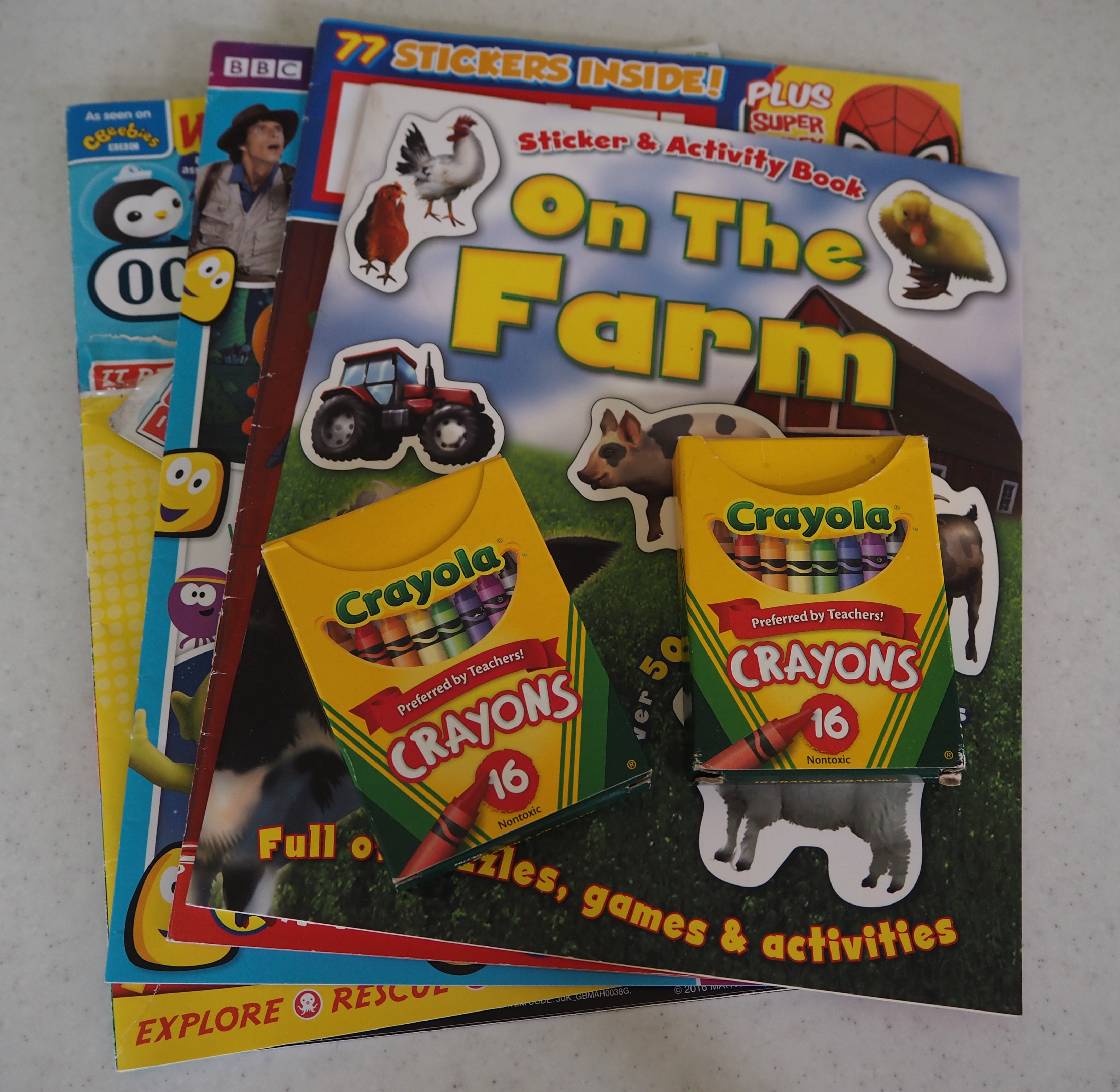 Magazines and colouring books, although now that my boys are a bit older, they are 6 & 4, they are not so interested in colouring on the plane. The pound shop or the book people are good places to pick up some cheap colouring or sticker books. If we get to the airport with plenty of time to spare I let them chose a magazine.